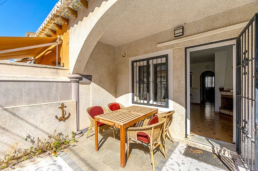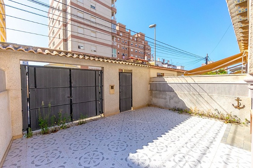 Warm welcome to Nueva Torrevieja a short distance from the center, the beach and the promenade. Here we present a nice large townhouse that offers you 4 bedrooms in a quiet area with many permanent residents. Through the gate you are welcomed by a large terrace of 69.98 square meters, plenty of space for outdoor furniture and a barbecue. Further through the entrance you enter the living room with fireplace and open plan to the kitchen. On this floor there is also 1 guest toilet and a dining room. On the second floor there are 3 bedrooms, 1 bathroom and a terrace. Upstairs there is a bedroom and roof terrace. The property is sold furnished, with appliances and air conditioning. This is an area that is lived in all year round. There are several local restaurants and shops nearby and the famous Friday market takes place very close by. This is the home for those who want to live centrally with proximity to the sea and the center. You are welcome to contact us today for viewing and information about this spacious townhouse.