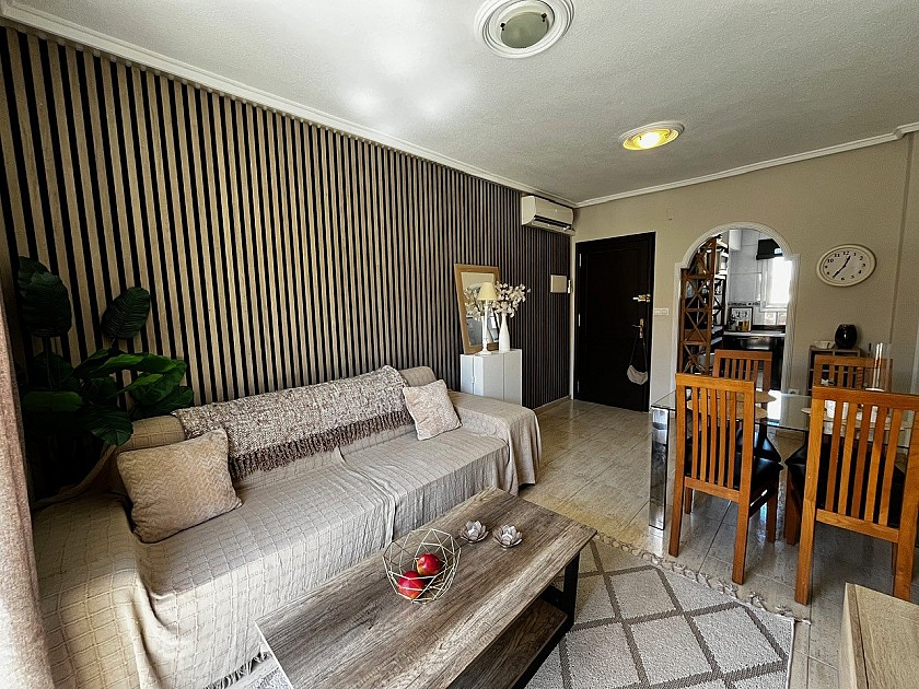 Fastigheten säljs fullt möblerad, så att du kan flytta in och slå dig ner direkt. Stora fönster i söderläge fyller vardagsrummet med naturligt ljus, vilket skapar en varm och inbjudande atmosfär hela dagen.