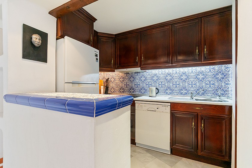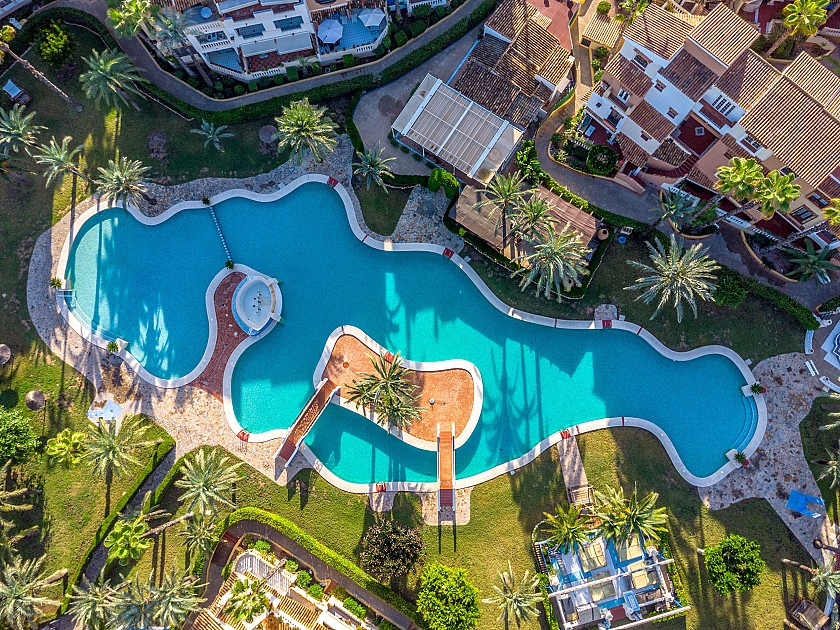 The area is built in a charming Mediterranean style with whitewashed facades, colourful details and small paths that wind through green communal areas with palm trees and flowers. Many of the homes have large terraces and balconies overlooking the garden, pool or sea.