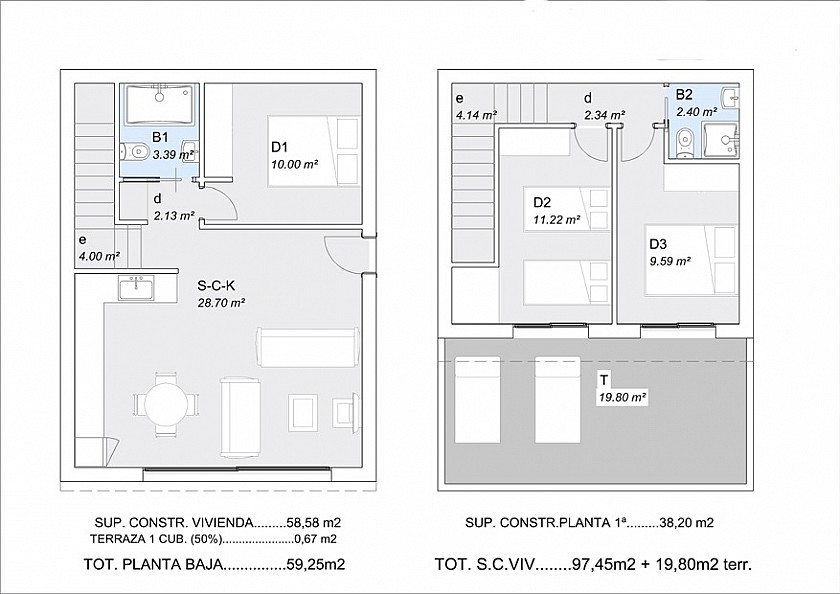 Juntas, las villas se dividen en dos planos con tres dormitorios y dos baños además de la opción de elegir una terraza en la azotea.