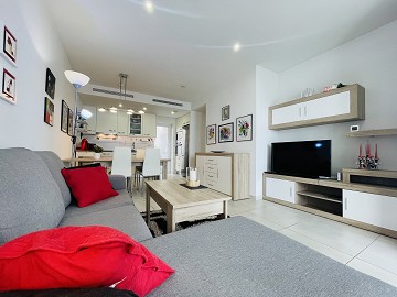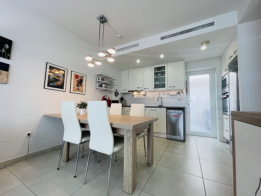 Le damos la bienvenida por la puerta de entrada y le damos la bienvenida a una sala de estar amplia y luminosa. Con un plano de planta moderno y abierto a la cocina que está totalmente equipada. Aquí tiene mucho espacio para un sofá, un mueble para la televisión, un aparador y una zona de comedor. Desde la cocina también se accede a un gran patio que es un gran trastero y aquí está la lavadora y mucho espacio para bicicletas, bolsas de golf y similares.