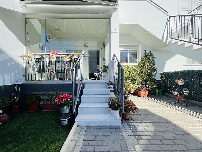 A través de la puerta a una bonita zona llegamos a este acogedor bungalow en la planta baja y aquí tiene una amplia terraza para el coche o muebles de exterior. Las escaleras suben a una terraza acristalada con ventanas correderas y plegables. Aquí hay mucho espacio para sentarse, perfecto tanto en verano como en invierno y cuenta con un gran toldo que se controla mediante mando.